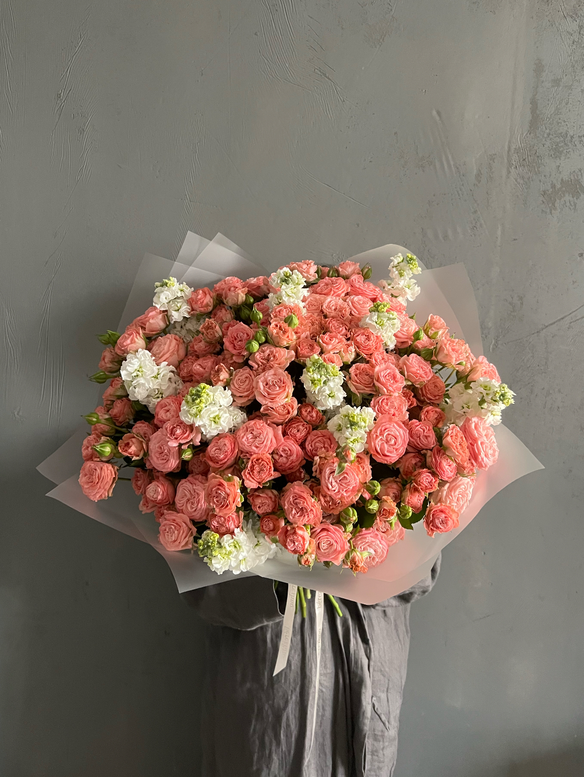 роза кустовая пионовидная, маттиола, аквабокс, сумка-переноска, фирменная открытка и инструкция