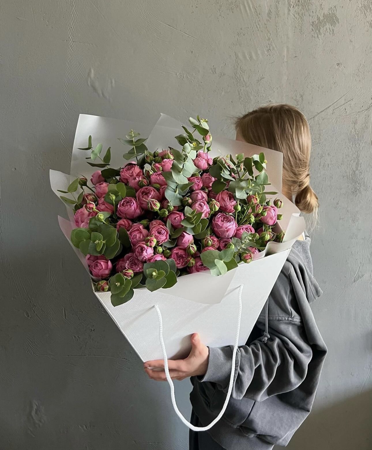 роза кустовая пионовидная, ветки эвкалипта, пленка матовая, аквабокс, фирменная открытка и инструкция