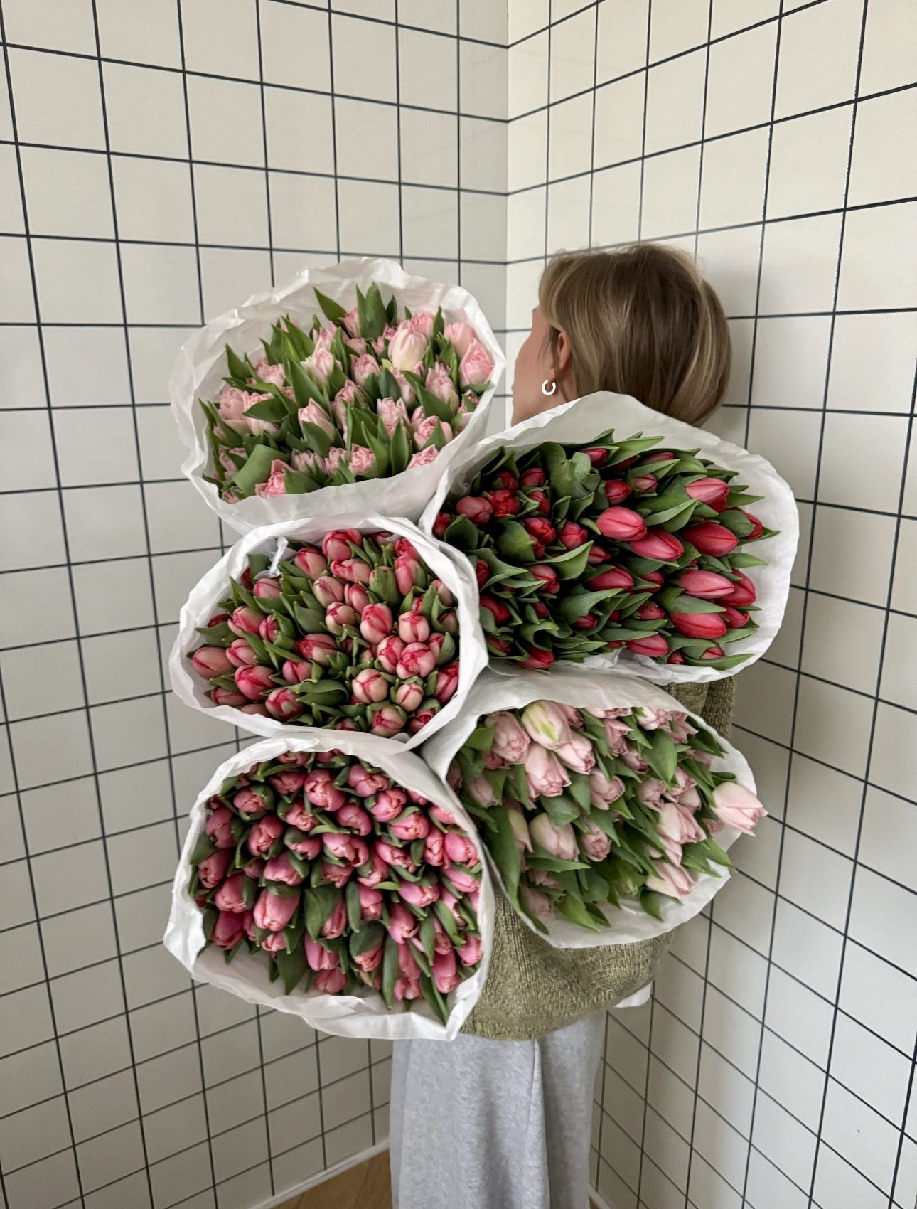 тюльпаны, пленка матовая, аквабокс, сумка-переноска, фирменная открытка и инструкция