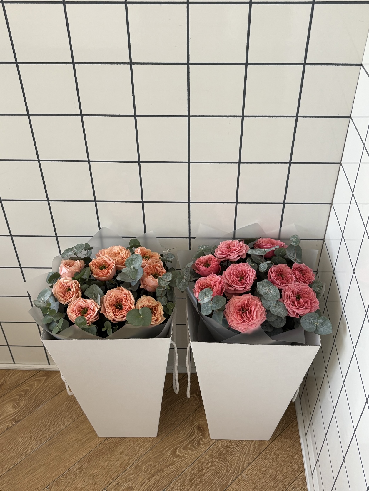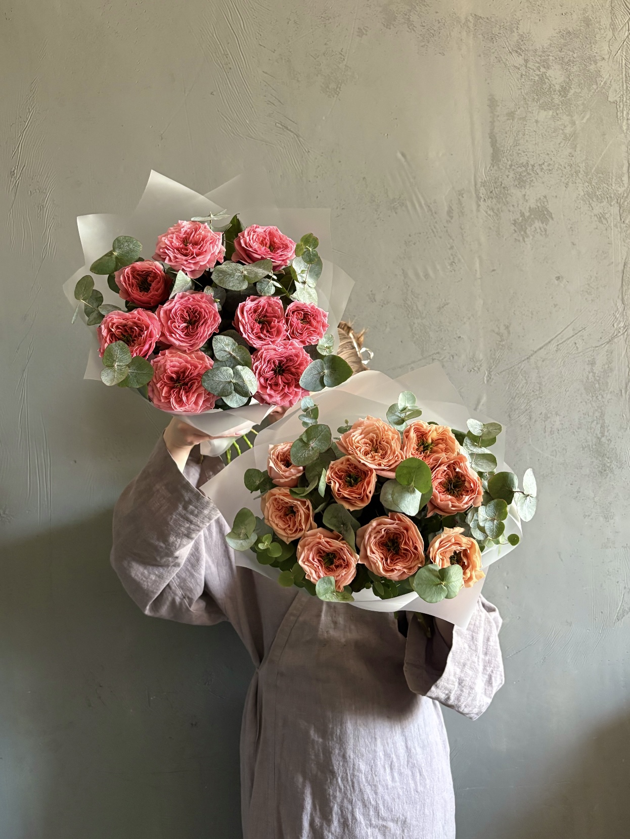 Пионовидные розы с эвкалиптом (цвет на выбор)