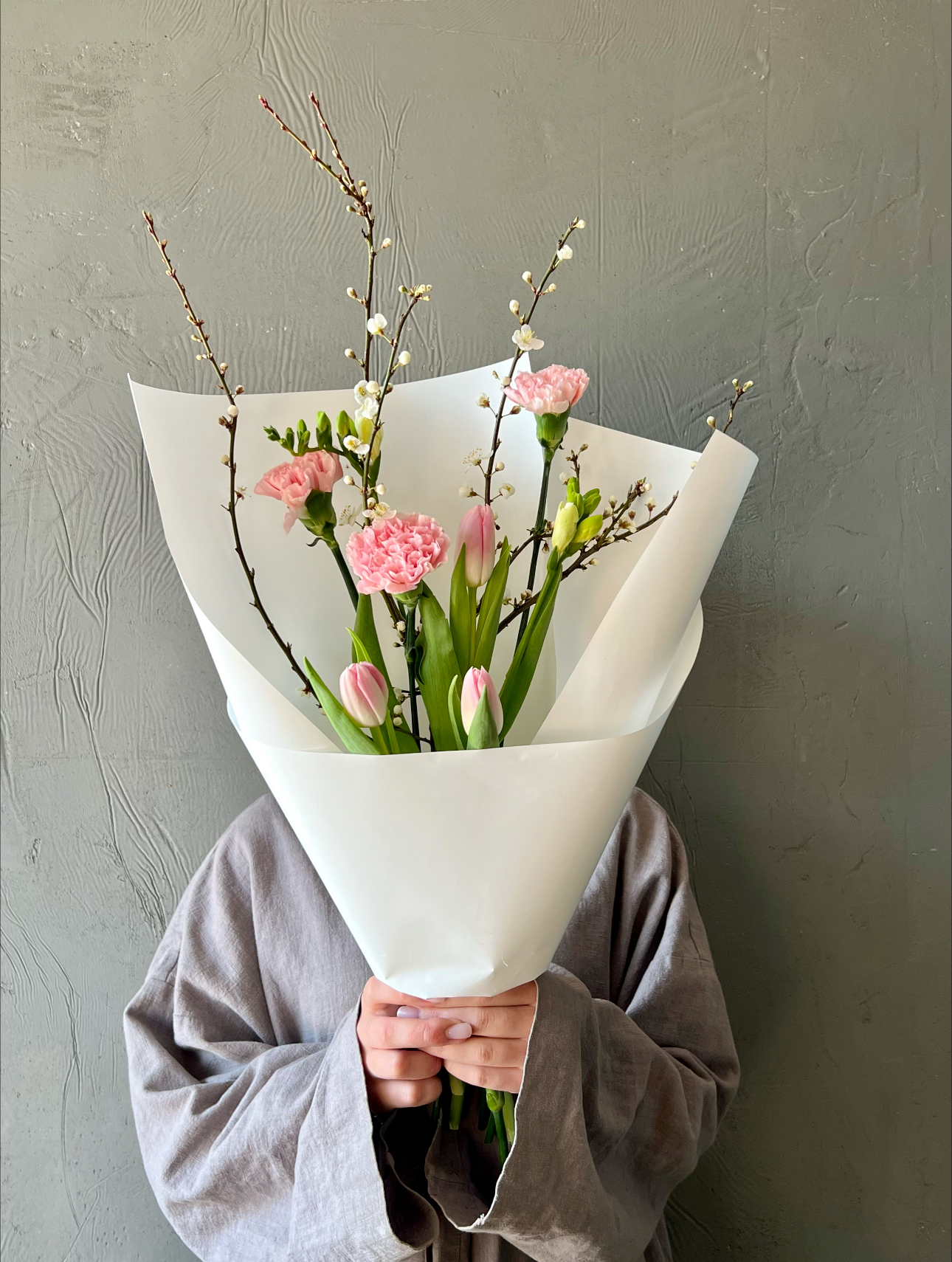 тюльпан - 3, гвоздика - 3, фрезия - 2, ветки, пленка матовая, аквабокс, сумка-переноска, фирменная открытка и инструкция