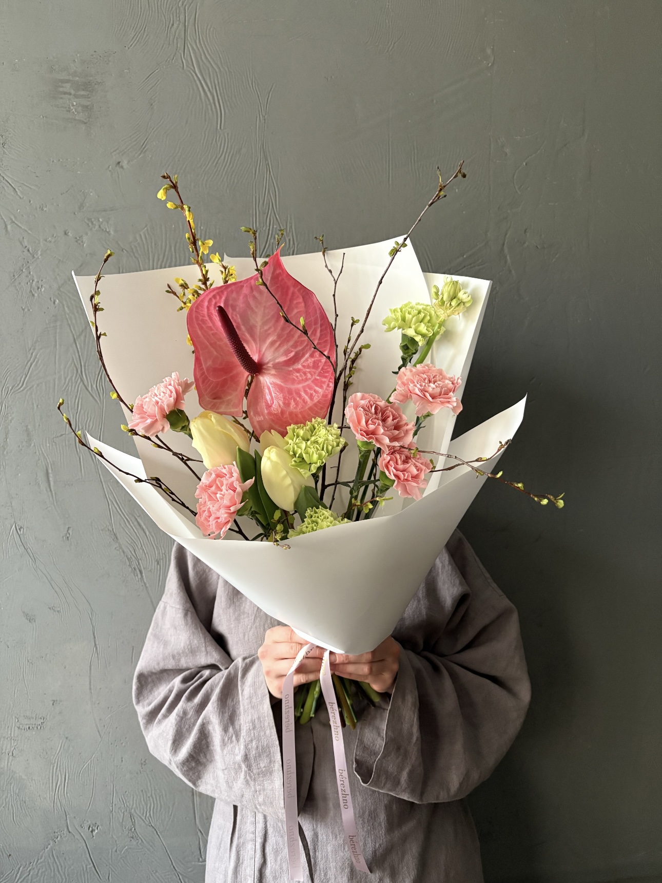 антуриум, гвоздика, тюльпан, ветки, пленка матовая, аквабокс, сумка-переноска, фирменная открытка и инструкция